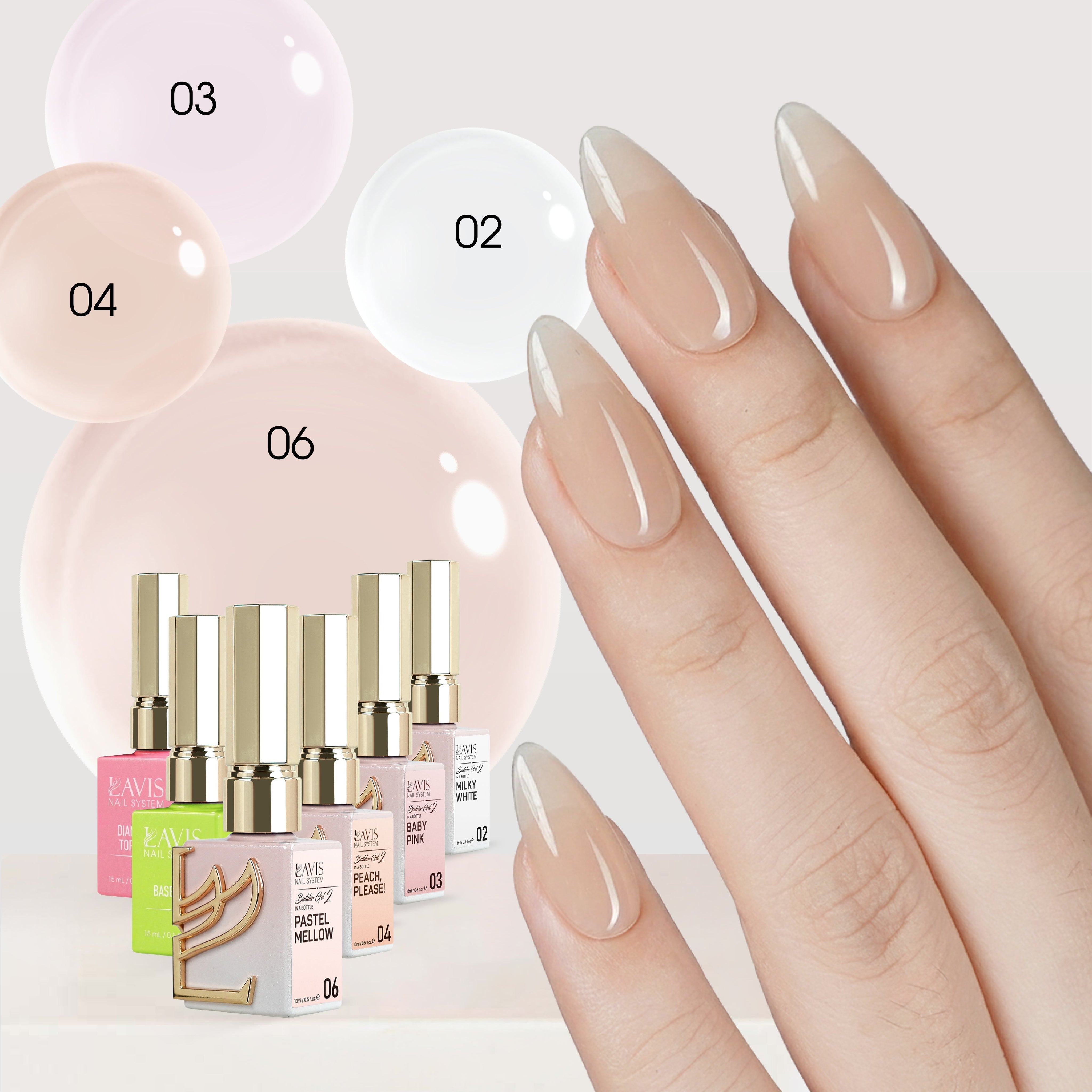 - LAVIS Builder Gel in the Bottle Kit 6: 02, 03, 04, 06, Base, Top - 15ml