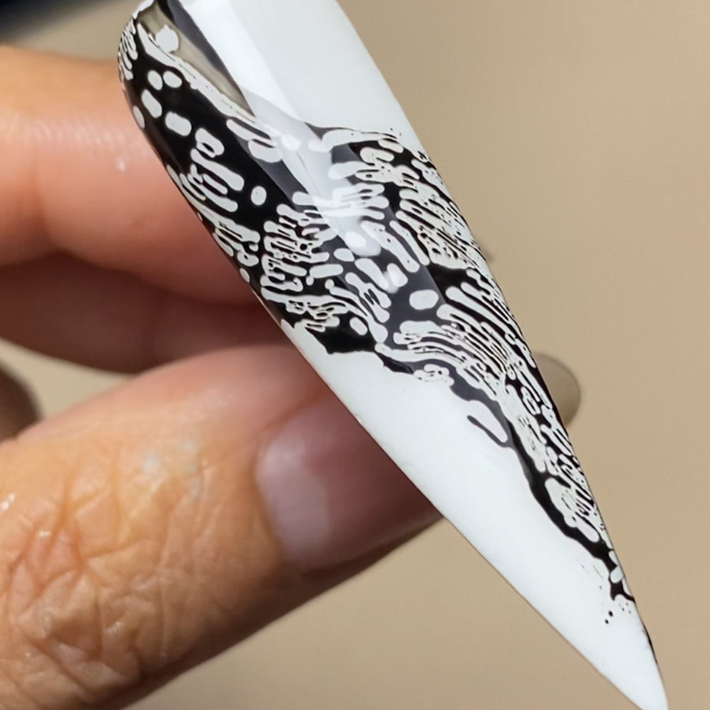 Be sure to wipe the tool clean between each stroke to keep your artwork crisp. Once the bloom effect reaches your desired look, cure to lock in the design. Finish with a top coat for a smooth, lasting finish.