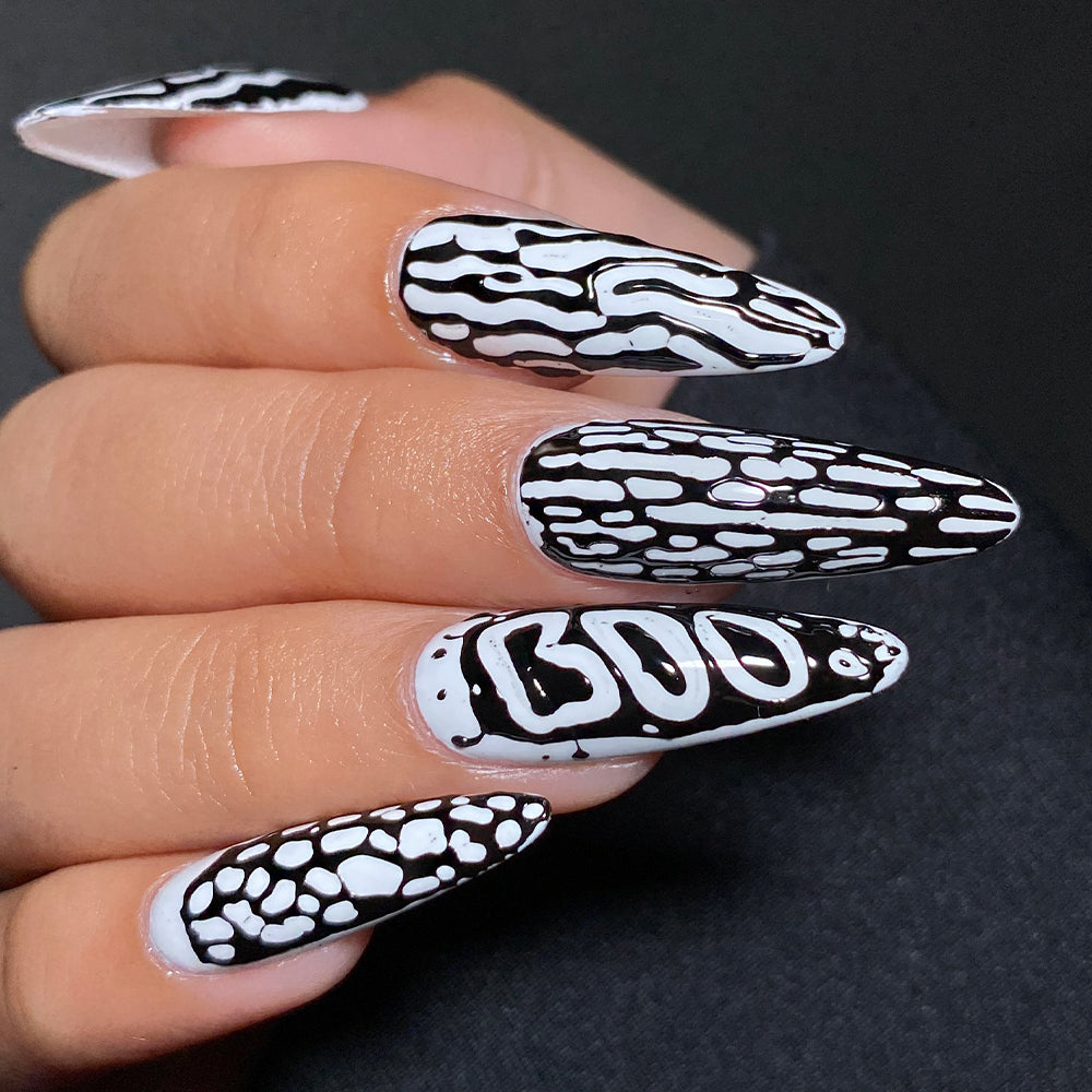 Start by applying LAVIS Magic Base Gel and curing for 60 seconds. Then, apply your chosen LAVIS Magic Color Gel and, while it’s still wet, use a dotting tool to sketch your design directly into the gel.