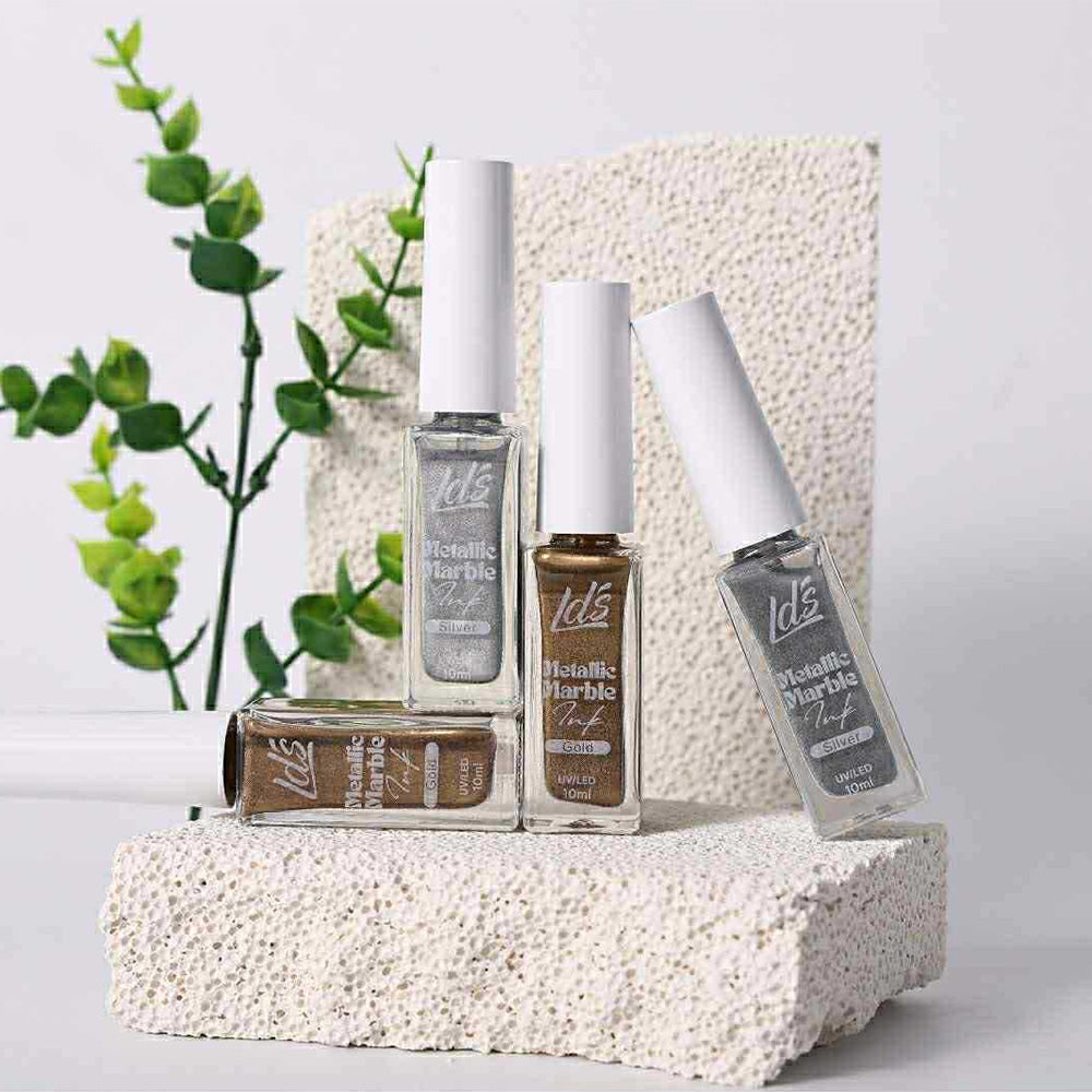 Unleash your creativity with LDS Metallic Marble Ink โ the perfect air-dry metallic liquid designed for effortless and striking nail art. Whether you're creating fine veining, fluid marble effects, or layering shimmer, this high-impact formula delivers a luxurious metallic finish that elevates any manicure. Ideal for both professionals and at-home artists, it dries quickly without the need for curing, making it a must-have in your nail art toolkit.