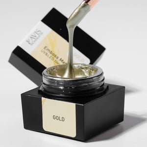 2. Next, apply a thin layer of the emboss gel polish in the gold color, ensuring even coverage.