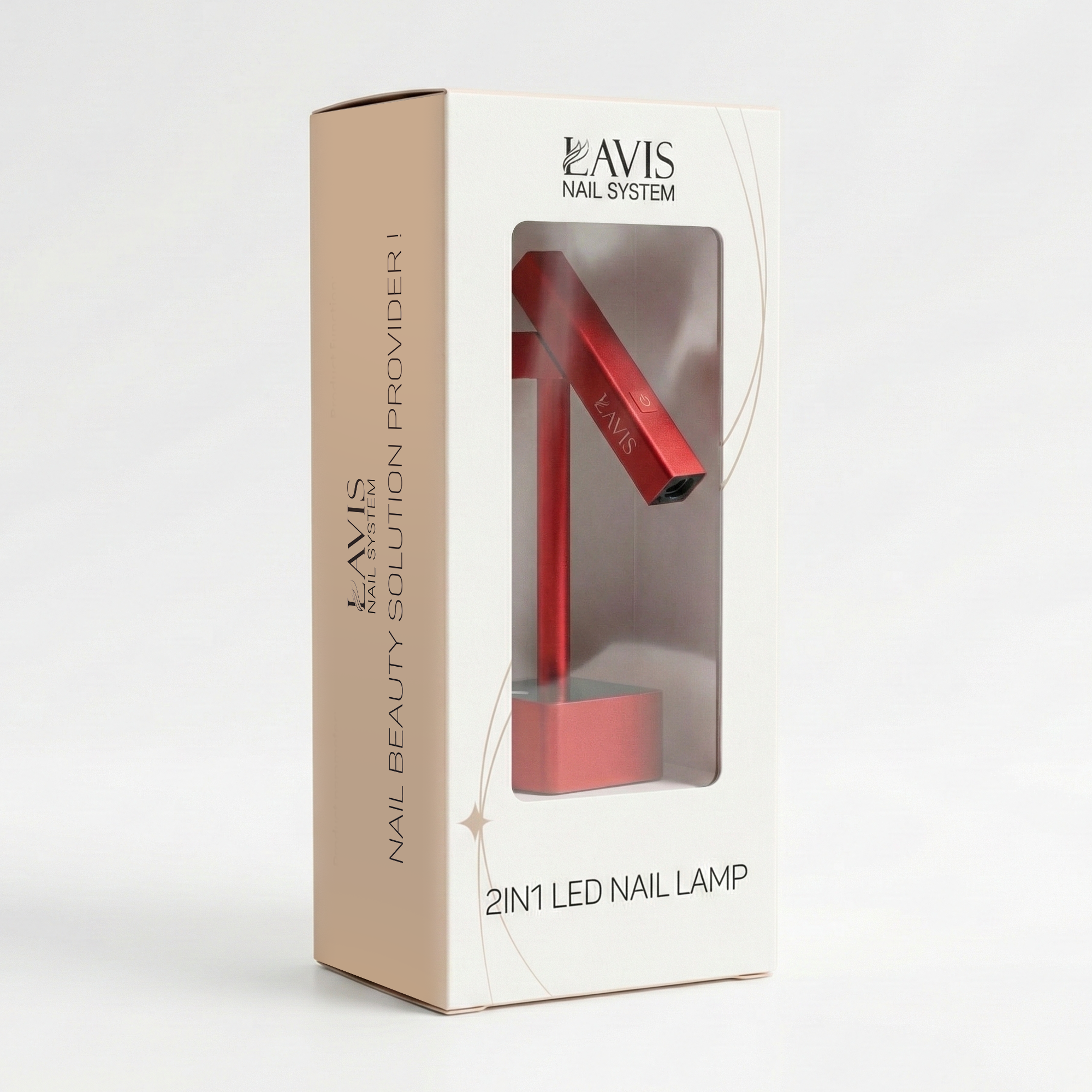 The LAVIS desktop nail lamp features a sleek, modern design with a compact structure and elegant red finish. It provides stable, focused lighting for precise nail work, making it ideal for professional salons and personal use.